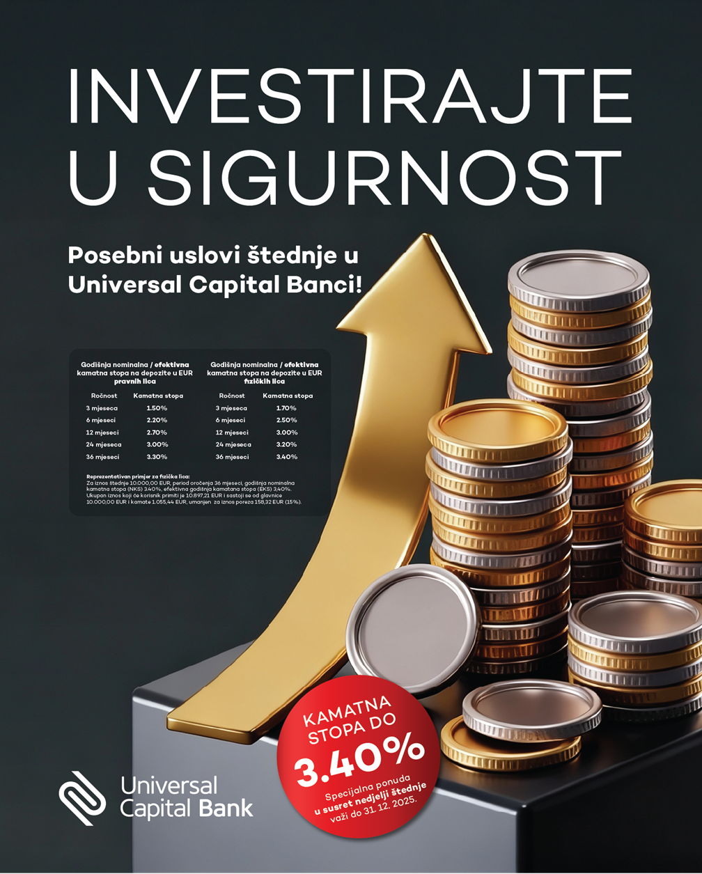 U vremenu kada je sigurnost ulaganja važnija nego ikad, Universal Capital Bank AD Podgorica je i ove godine, u susret Nedjelji štednje, pripremila posebnu ponudu za sve klijente (građane i privredu) koji žele da osiguraju stabilnost i planiraju budućnost. Banka nudi posebne uslove anticipativne i deponovane štednje, sa kamatnim stopama do 3,40% godišnje, namijenjene svima koji žele da svoj novac stave u sigurne ruke.